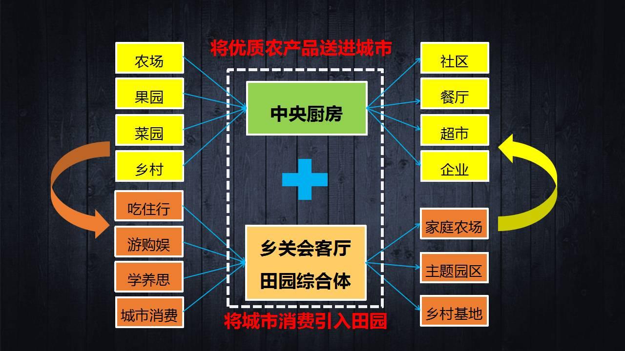 乡关共同社联合汉唐农业集团共同研发出品的特色小镇盈利项目——田园综合体·中央厨房便是针对休闲农业缺乏新意、创新不足,无法盘活已有农业资源,激发农业土地利用价值的行业痛点所研发出品的产品。